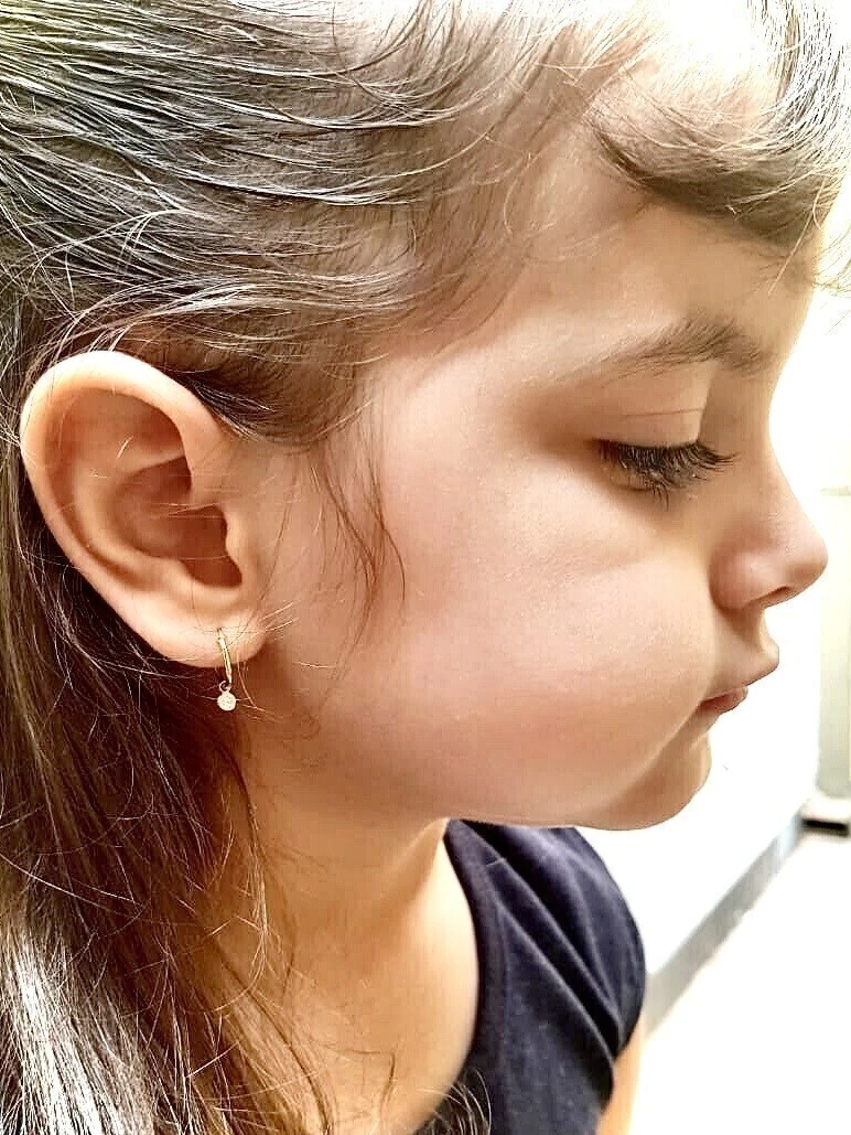 Argola em Ouro Amarelo 18K com pingentinho de Topázio Branco de 3mm (cada pedra) com cravação inglesa.