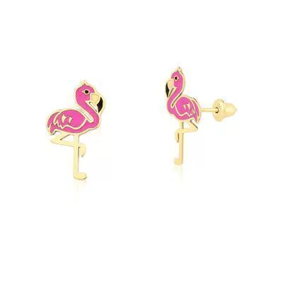 Lindo Brinco Flamingo Rose em Ouro Amarelo 18K esmaltado na cor rosa, um verdadeiro charme!