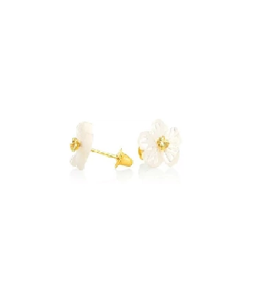 Brinco Flor de Madre Pérola em ouro amarelo 18k com uma pedrinha amarela de zircônia no centro garantindo brilho, contraste e beleza!