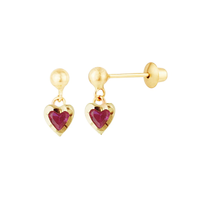 Brinco em Ouro Amarelo 18K Bolinha Pingentinho de Coração em Pedra Vermelha (zircônia), com movimento!