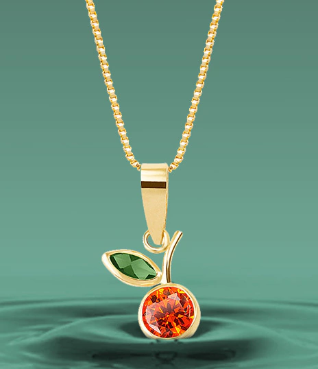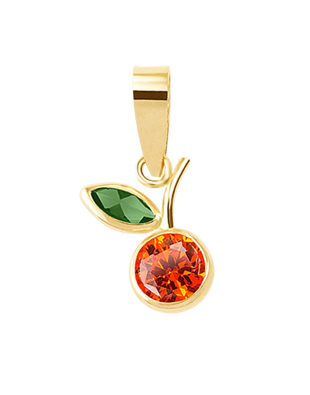 Pingente Laranjinha da coleção Pomar da Sofie em ouro amarelo 18K com pedra Granada Mandarim, folha em pedra peridoto, medindo aproximadamente 1cm com a contra argola
